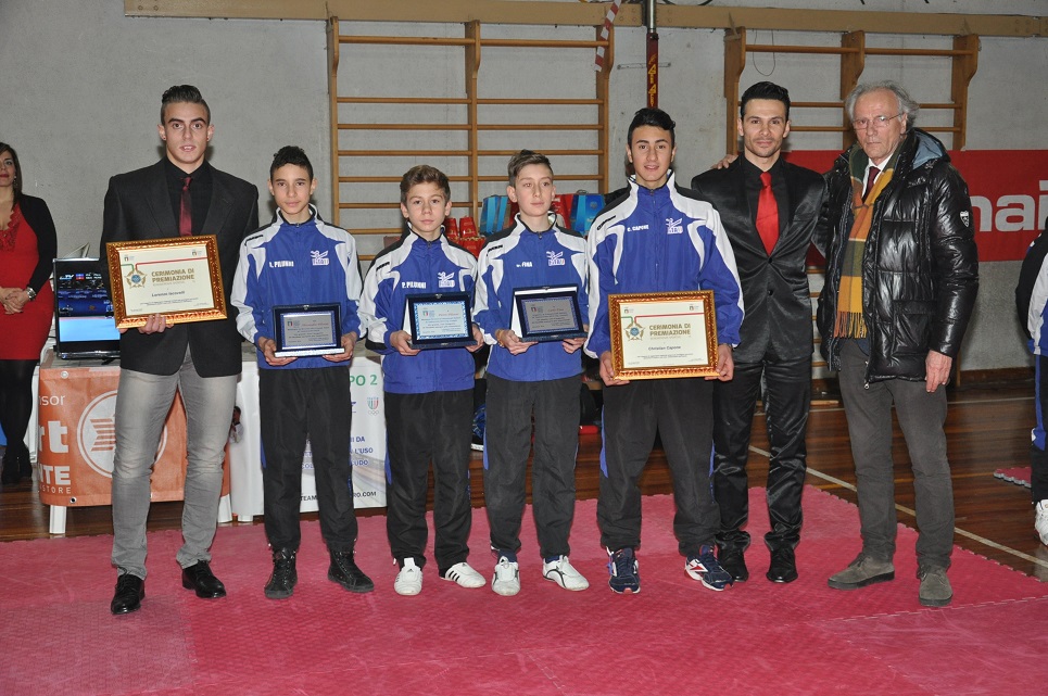 A mettersi ancora una volta in evidenza è stata anche l’A.S.D. Accademia del Taekwondo guidata dal Maestro Gianluca D’Alessandro, facente parte della Fita, che ha visto i successi di Lorenzo lacovelli (PluriCampione Italiano Universitario categoria ed atleta azzurro per i mondiali Universitari in Korea), Cristian Capone (3° classificato Campionato italiano Junior categoria 45 kg) e Adolfo Bilotta (3° classificato Campionato Italiano junior categoria 45 kg). Risultati che hanno permesso alla prestigiosa scuola Irpina di ricevere ben tre targhe per le benemerenze del CONI provinciale per la scorsa stagione sportiva. A questi vanno aggiunti i risultati nazionali degli altri atleti del M° D’Alessandro, il quale nella scorsa stagione sono saliti sul podio nazionale nella categoria Cadetti. Per loro le benemerenze del CONI provinciale non sono arrivate in quanto non ancora 15enni, quindi il M° D’Alessandro coadiuvato dal delegato CONI Avellino hanno organizzato una premiazione nell’ambito degli esami sociali dell’Accademia del taekwondo By team D’Alessandro. Infatti il giorno Sabato 19 Dicembre presso la Palestra della scuola Media Raffaele Masi di Atripalda, al cospetto di quasi 300 persone, il Delegato CONI Avellino, Prof. Giuseppe Saviano ha consegnato personalmente le targhe agli atleti: Pilunni Pietro, per il BRONZO conquistato ai campionati Italiani Cadetti 2015, a Carlo Fina per la medaglia d’Argento cadetti e ad Alessandro Pilunni per il BRONZO in coppa Italia sempre nella stagione 2015. Quindi ben sei atleti e tutti Made in “Accademia del Taekwondo M° D’Alessandro”.