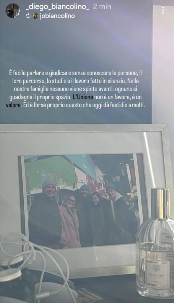 A prendere le difese del fratello sono stati Giovanna e Diego Biancolino, con un post pubblicato e ricondiviso su Instagram. A corredo di una immagine che ritrae la famiglia Biancolino al gran completo, un testo eloquente: È facile parlare e giudicare senza conoscere le persone, il loro percorso, lo studio e il lavoro svolto in silenzio. Nella nostra famiglia nessuno viene spinto avanti, ognuno si guadagna il proprio spazio. L’unione non è un favore, è un valore. Ed è proprio per questo che dà fastidio a molti”.