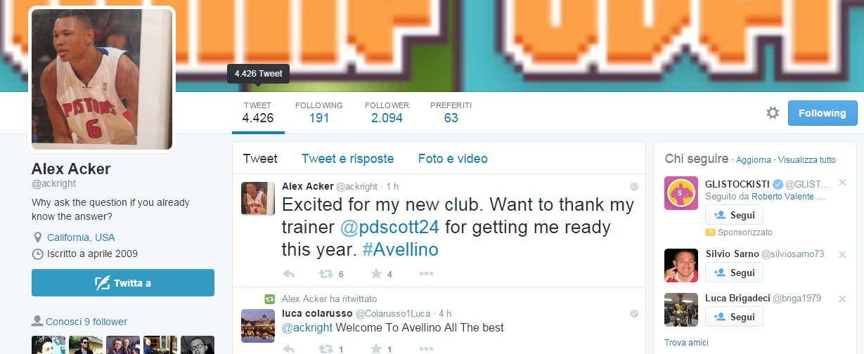 “Excited for my new club. Want to thank my trainer @pdscott24 for getting me ready this year. #Avellino. “Alex Acker”