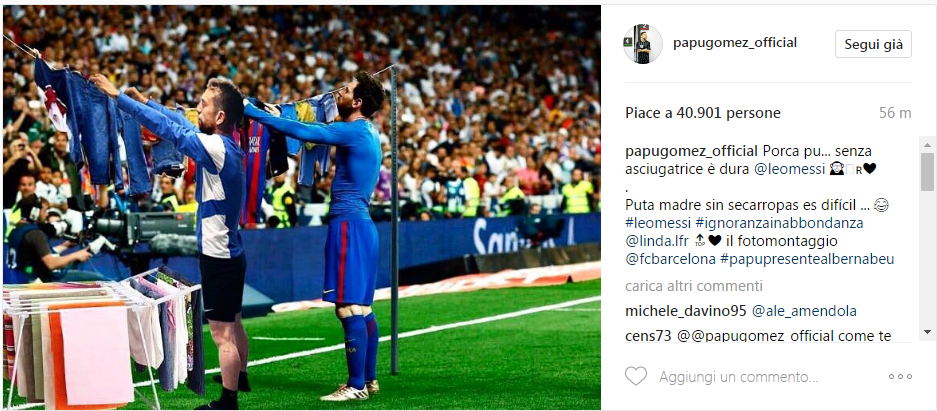 Eccola. E’ arrivata. Papu scherza con il connazionale Messi e sull’esultanza dopo la vittoria di ieri sera contro il Real Madrid. Il messaggio che Gomez gira a Messi è chiaro: “Porca pu…. senza asciugatrice è dura”…. Come dargli torto?