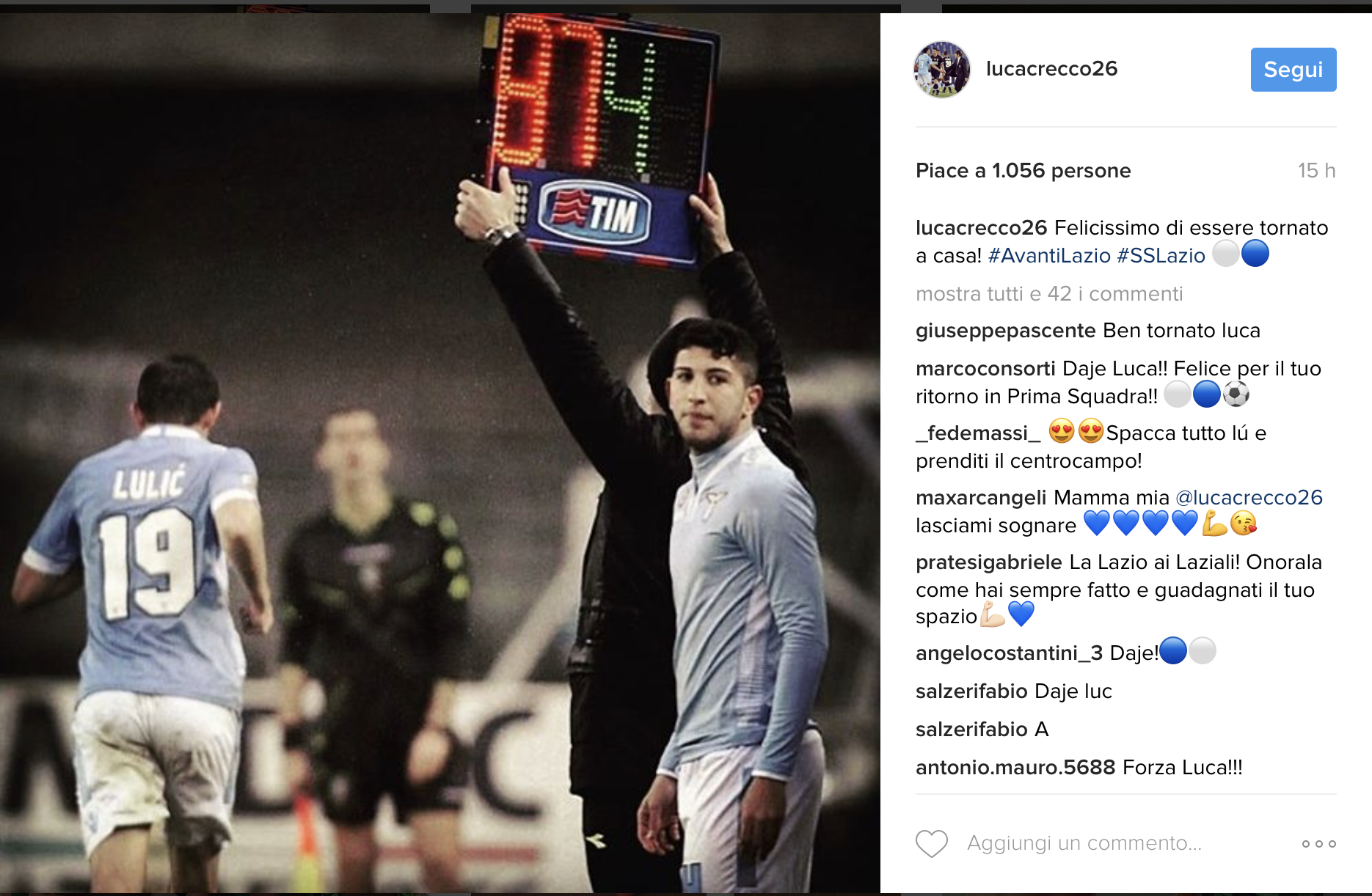 Crecco torna in casa Lazio: Il suo commento su Instagram