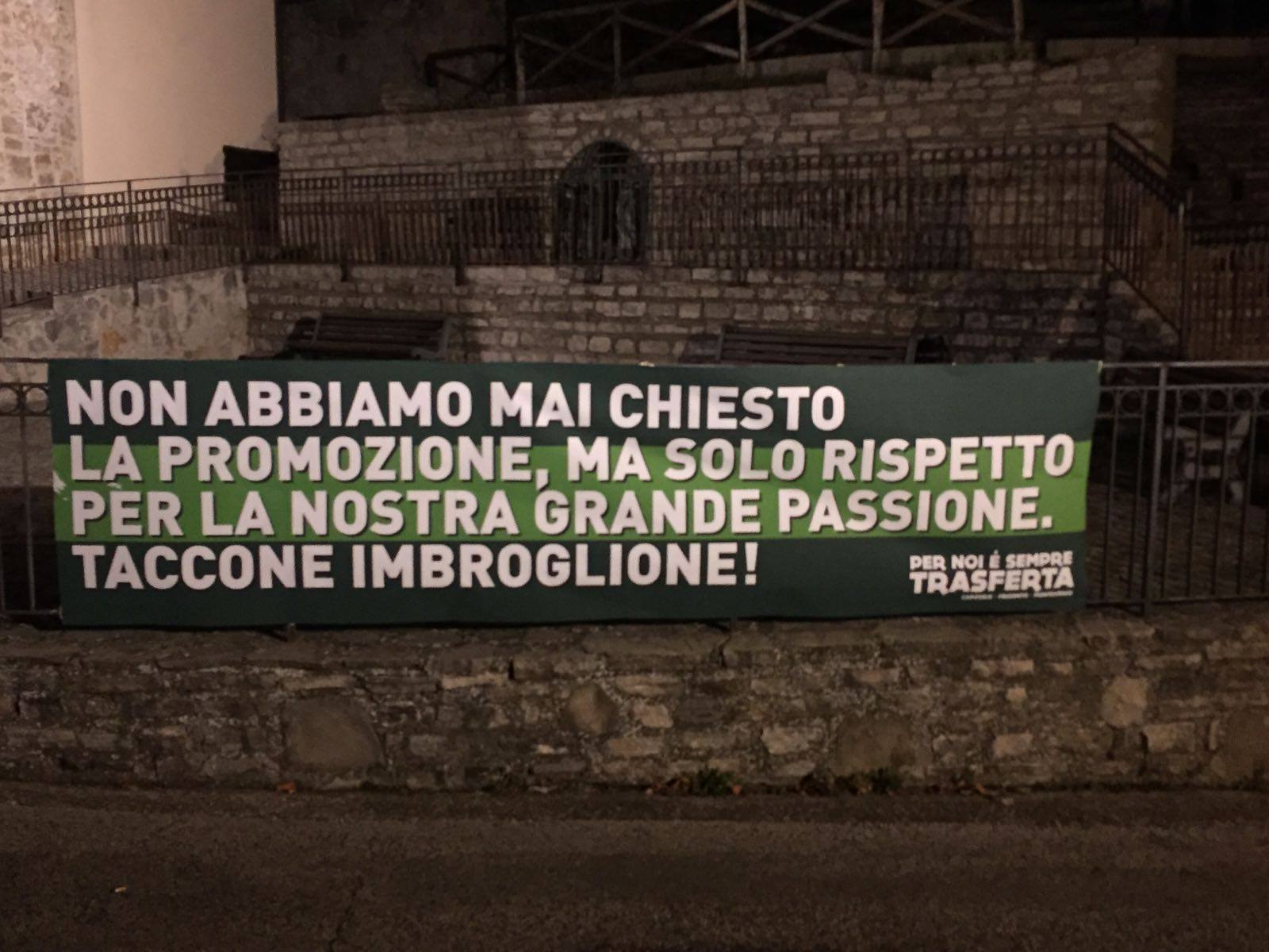 “Non abbiamo mai chiesto la promozione, ma solo rispetto per la nostra grande passione. Taccone imbroglione!”. Sulle mura del centro storico di uno dei borghi più belli d’Italia, e precisamente a Monteverde, l’Avellino ultras grida ancora la sua rabbia. Nel segno della coerenza e della mentalità, non basta una vittoria per fermare la contestazione nei confronti di Taccone e Gubitosa. E così, ecco l’ultimo striscione che riecheggia in una Provincia stanca che dice basta e che non vuole essere complice di scelte scellerate da parte di una dirigenza che tarda a prendere decisioni importanti.