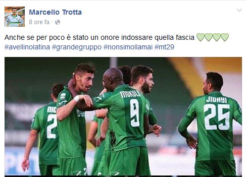 Minuto 57 di Avellino-Latina. Sostituzione. Esce Arini entra D’Angelo. Sembra un normale cambio per tutti non per Marcello Trotta a cui viene data la fascia di capitano. “Anche se per poco è stato un onore indossare quella fascia” queste le parole del giocatore espresse tramite il suo profilo Facebook. In molti aspettavano il passaggio di consegna tra Arini e D’Angelo ma sulla distinta di gioco il vice capitano era Trotta e dunque il giocatore di Santa Maria Capua a Vetere ha provato l’emozione di indossare quella fascia, un’emozione che ha voluto condividere con il popolo biancoverde.