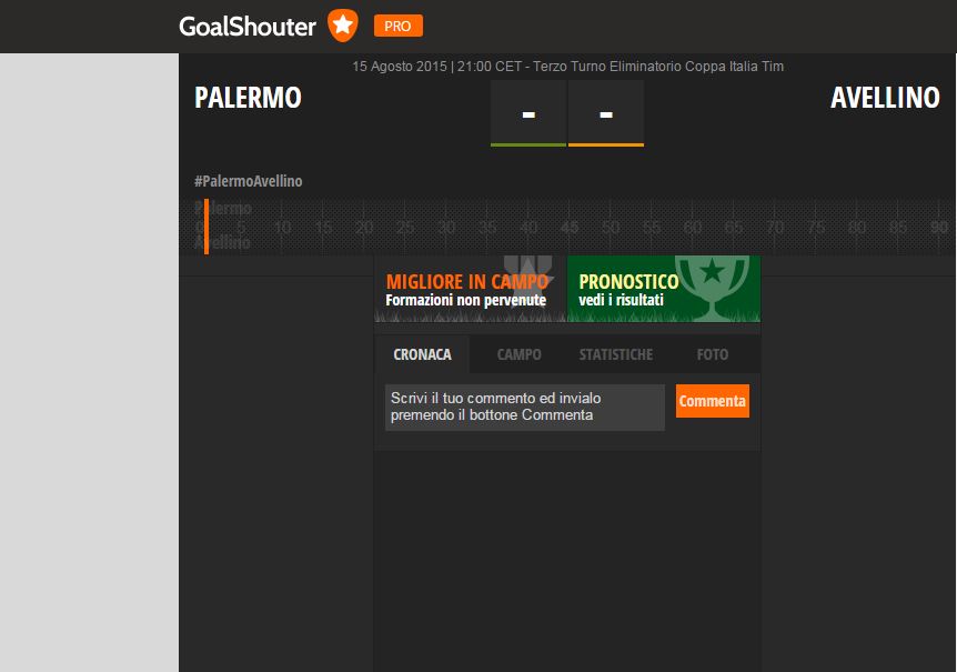 Da stasera inizia una nuova era anche per Sportavellino.it. Abbiamo deciso di aderire al programma GoalShouter, uno dei migliori in assoluto nel panorama italiano e sperimentato da mesi anche da società professionistiche come il Vicenza Calcio, la Pro Sesto, il Chiasso (formazione svizzera), Cremonese, Campobasso. SportAvellino.it, grazie ad Alfredo Spinale, sarà presente al Barbera di Palermo per seguire il live della sfida del terzo turno di Coppa Italia. Una nuova piattaforma, molto lineare, che darà la possibilità di votare, durante la sfida, il pronostico del match e del migliore in campo. Da subito svilupperà le statistiche che siamo abituati a vedere sui grossi canali di informazione come Sky. Statistiche complete per possesso palla, calci d’angolo, ammonizioni, espulsioni, tiri in porta, tiri fuori, parate, punizioni, falli commessi. Insomma, di tutto di più per un nuovo progetto che ci accompagnerà per tutta la stagione agonistica. Ed i protagonisti sarete voi, con commenti che saranno pubblicati live. Insomma, non resta che seguirci. Da stasera, a partire dalle 20.30, la diretta testuale (per chi non può seguire la tv, diretta RaiSport1 a partire dalle 20.55). A breve il collegamento sul sito SportAvellino.it.