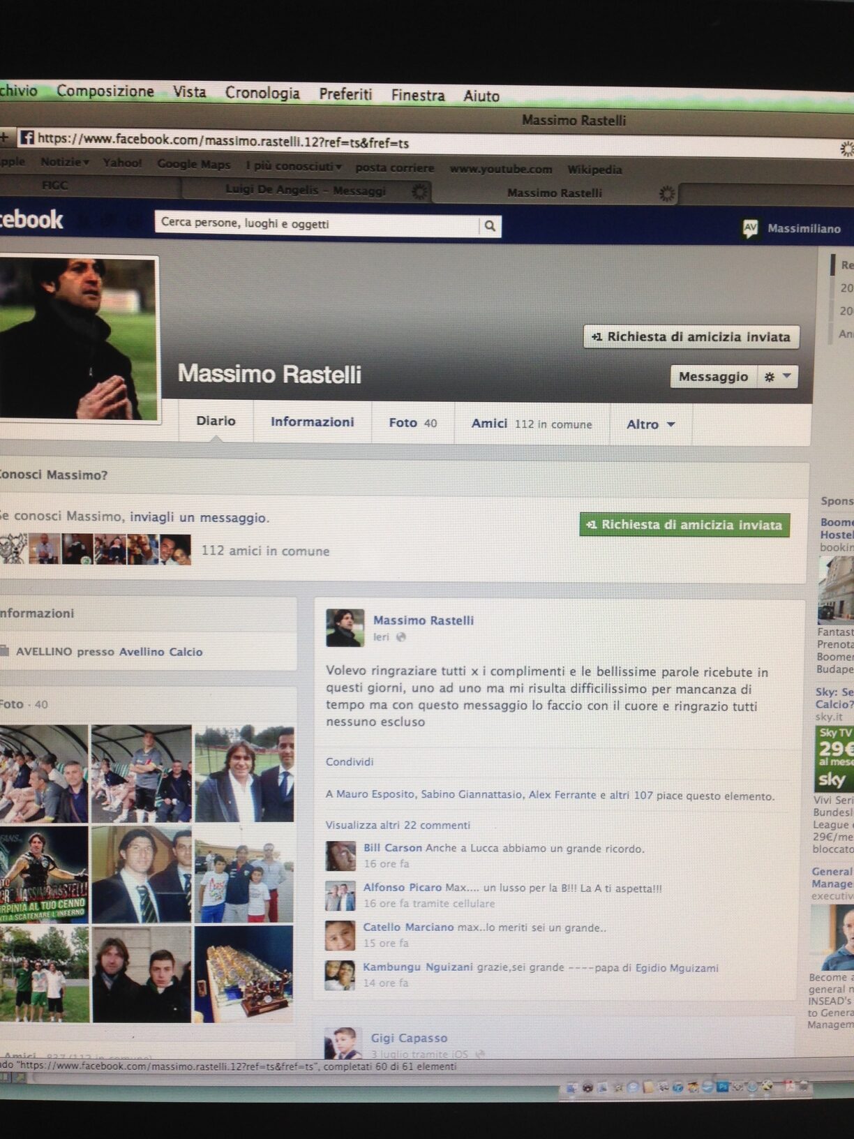 “Non ho nessun profilo facebook, non ho tempo per divertirmi. Non ho fatto nessuna dichiarazione sui social network. Chi utilizza questo account non sono io. E mi sono tutelato in ogni sede opportuna. Ho fatto denuncia alla Questura stamattina ho presentato denuncia contro ignoti anche alla polizia postale che adesso farà tutti gli accertamenti del caso. Spero, che con questo mio appello, la si smetta una volta per tutte di utilizzare il mio nome per queste cose”. Massimo Rastelli fa chiarezza dopo che nella giornata di ieri molti siti internet e anche quotidiani avevano riportato le sue dichiarazioni di ringraziamento a squadra e tifosi. “Le dichiarazioni a me attribuite erano innocue ma immaginatevi se qualcuno si diverte a dire cose gravi cosa succede. Ho letto su Tuttoavellino, Avellino-calcio, Ottopagine e dappertutto le mie dichiarazioni. Non ho scritto niente. Bastava una telefonata ed avrei smentito. Bastava un colpo di telefono anche all’addetto stampa. invece mi costringete a smentire oggi”