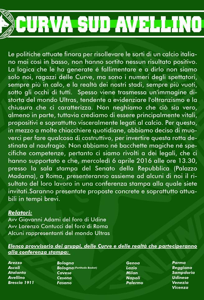 Un’unità di intenti per salvare il calcio italiano direttamente da parte di chi lo vive a pieni polmoni. Il mondo Ultras italiano discuterà insieme a dei legali che hanno supportato la loro azione di come risollevare le sorti del mondo del calcio mercoledi 6 aprile presso la sala stampa del Senato della Repubblica. Saranno presentate proposte concrete e soprattutto attuabili in breve tempo.